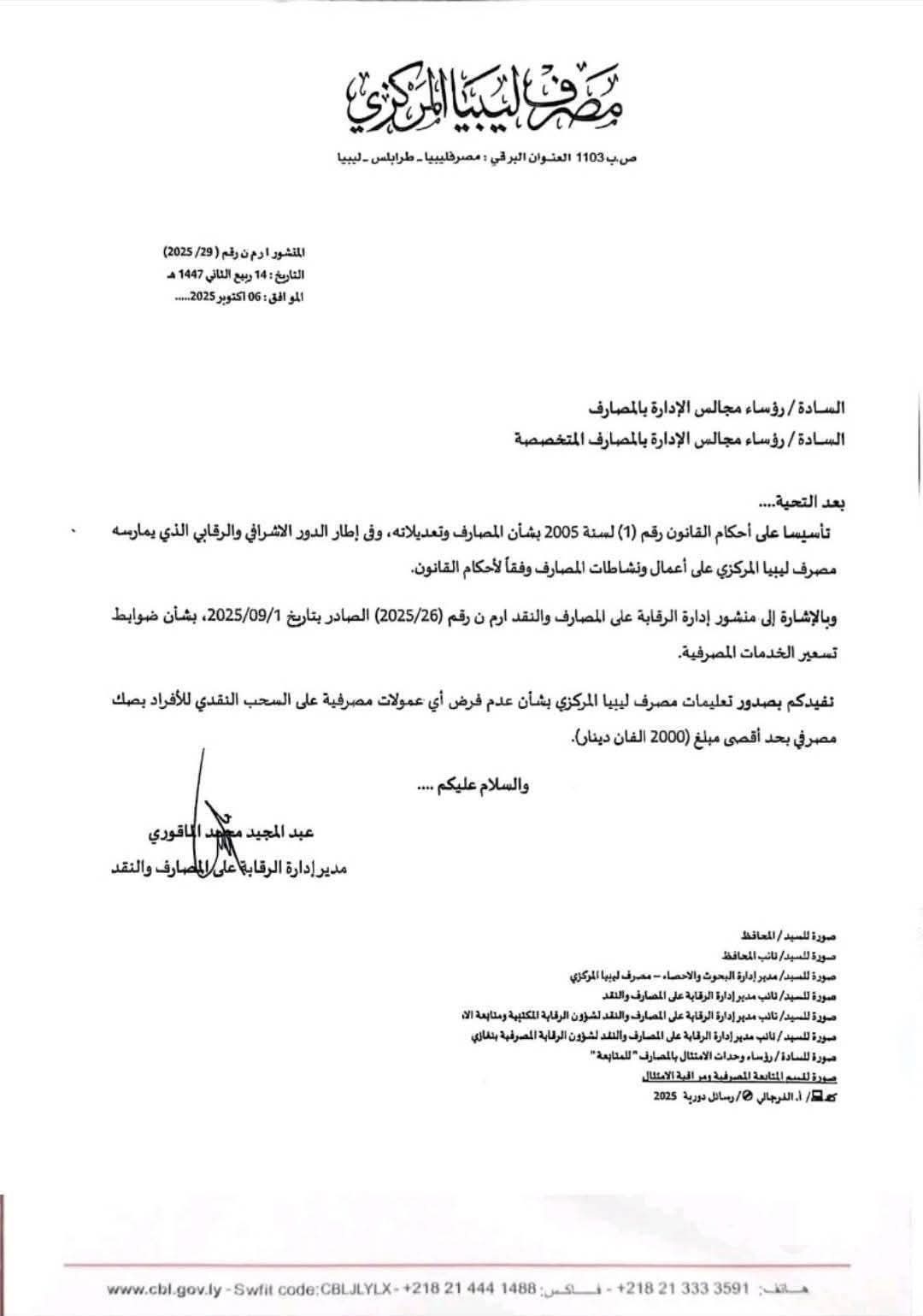 مصرف ليبيا المركزي يستجيب للملاحظات ويُصدر تعليماته للمصارف بعدم فرض أي عمولات مصرفية على السحب النقدي للأفراد بصك مصرفي بحد أقصى مبلغ 2000 دينار .